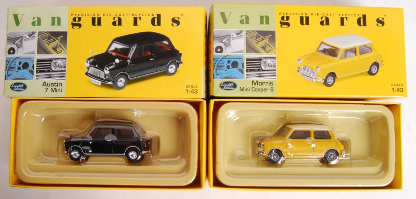 A collection of 10x assorted 1:43 scale Vanguards precision diecast models. To include; VA01306, VA06101, VA03405, VA04504, VA07100, VA05205, VA06900, VA08600, VA01509 & VA08700. All boxed, mint. Wing mirrors never attached.