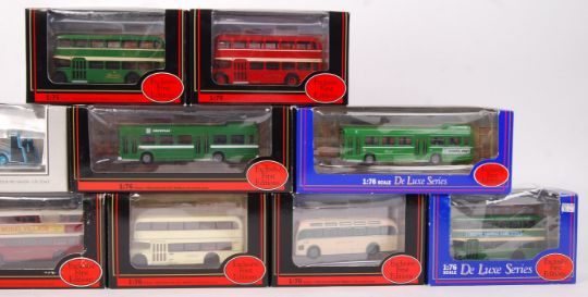 A collection of 10x EFE 1:76 Scale trackside diecast model buses and related items. Comprising of model numbers; 14101, 13901, 15102, 16503 (x2), 15104DL, 14006DL, E16208, 13001, and 14003. All models appear mint, within the original boxes.