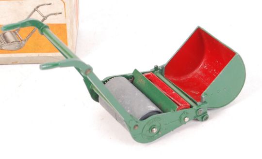 A charming vintage Dinky Toys made diecast model No. 751 ' Lawn Mower '. Appears complete with grass bucket to front. Working mechanism. Condition: very good+ to near mint. Original white/orange box present and also very good+ (surface tear to upper edge - see images. Rare model.