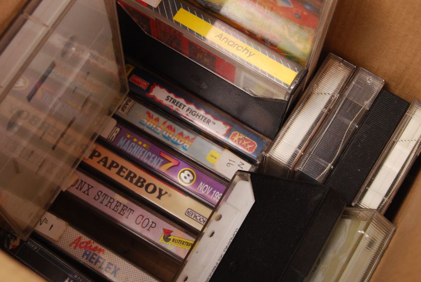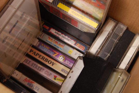 An original vintage Sinclair made ZX Spectrum + 2 games console, within the original box. Along with a ZX Spectrum, Light Gun, Joy Stick and a large quantity of assorted game cassettes - which include; Ghostbusters, Teenage Mutant Ninja Turtles, Kickstart, Dr Maddo and many others. Some leads also present. Good assortment.
