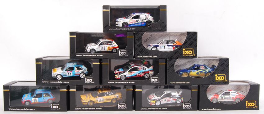 A collection of 10x Ixo Models 1:43 scale precision diecast model rally cars to include; RAC227, RAM428, RAM361, RAC217, RAC070, RAM440, RAM184, RAC110, RAC165 & RAC199. All within their original plastic cases, with outer sleeves.