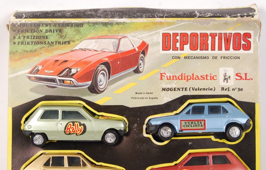 A rare 1970's Spanish made plastic model car in-store shop advertising display trade board of assorted ' Deportivos ' model cars. Complete, with all models (in various colours and versions). All models appear mint and unused. The original backing board present, with artwork to top. ' Made In Spain .' Large scale cars, the whole item measures approx; 54cm x 35cm. Original outer slipcase trade box also present.