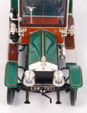 A rare highly detailed Franklin Mint 1:24 scale diecast model ' 1907 Rolls Royce Silver Ghost '. Green, with black roof. Appears mint, with tag, within the original polystyrene box. Incredibly detailed diecast model.