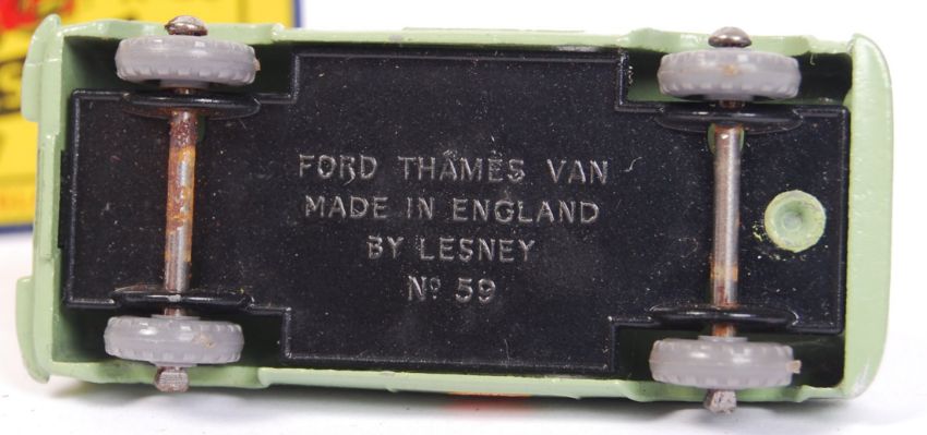 An original vintage rare Matchbox Moko Lesney boxed diecast model No. 59 ' Ford Thames Van - Singer '. Green, with black base and grey plastic wheels. Model in superb mint+ condition within a very good original box. Rare.