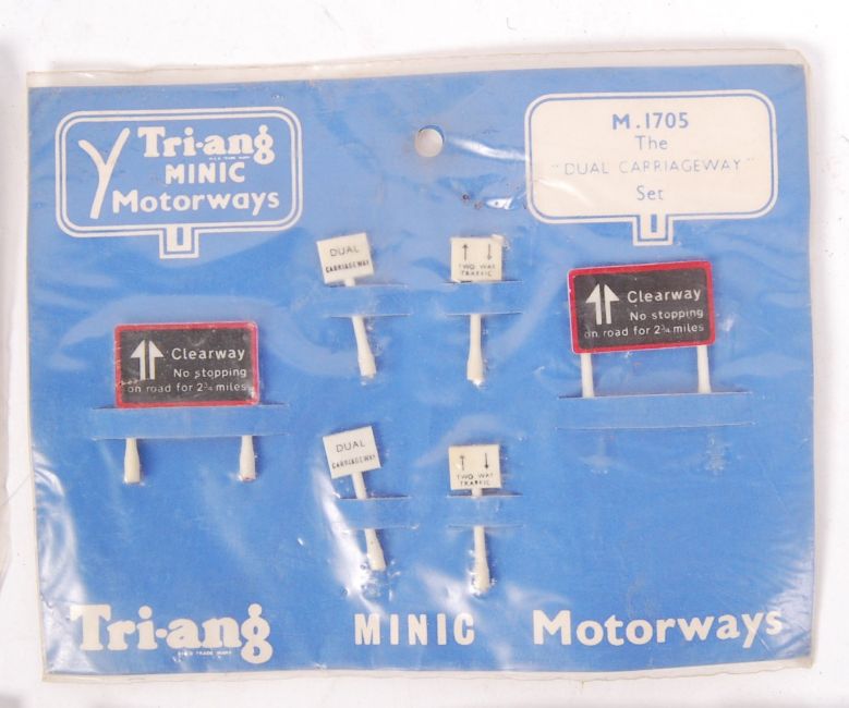 A fabulous set of 4x vintage ex-shop-stock factory sealed Triang Minic Motorways roadside sign sets - M1705 The Dual Carriageway (x2), M1702 The Country and M1701 The Motorway. All factory sealed, all with contents mint. Rare in this form.