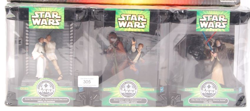 An original Hasbro made Star Wars ' Silver Anniversary 1977-2002 ' action figure group set to include; Luke Skywalker & Princess Leia, Han Solo & Chewbacca & Obi-Wan Kenobi & Darth Vader. All appear mint & complete, within their original boxes. Also to include Kenner ' Collectors Pack ' to include figures; Han Solo, Chewbacca & Lando Calrissian. All on their original card backs.
