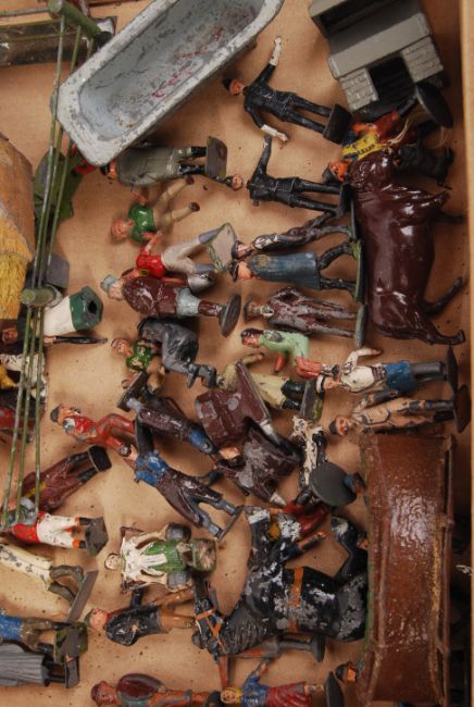 A large collection (x2 boxes) of assorted vintage Britains (and other) lead farm figures and accessories. Comprising of over 40x assorted farm related figures, a large collection of animals, various scenic elements, some Dinky / Britains tractors and other items. Great collection.
