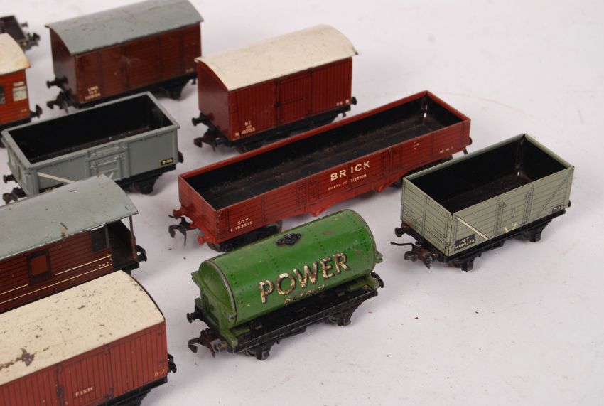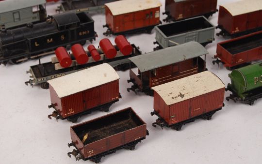 A collection of assorted vintage Hornby Dublo 00 gauge railway trainset rolling stock. To include; EDL7 6917 Locomotive , and various wagons / carriages etc. All diecast / tin construction.