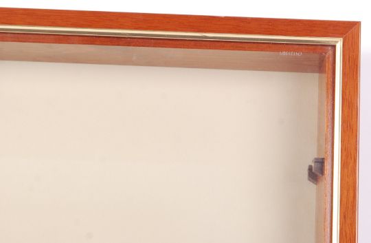 A very well made diecast model / model railway 00 gauge train locomotive display cabinet. Mahogany construction, with gilt banding to the outer edge. 9 shelves within. Fully glazed, complete with all glass shelves. Great condition.  Measures approx: H85cm x W43cm x D9cm (shelf width approx 6.5cm)