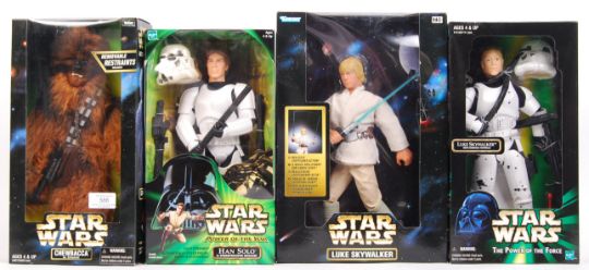 A collection of 4x Kenner made Star Wars 12" action figures. All appear mint and factory sealed, within the original boxes. Comprising of; Chewbacca, Power Of The Jedi Han Solo, Power Of The Force Luke Skywalker, and Luke Skywalker. Sealed.