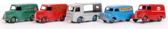A charming collection of 5x original vintage Dinky Toys diecast model early advertising vehicles. To include; 30V NCB Electric Van, Trojan Esso, Bedford Ovaltine, Trojan Dunlop Tyres and Trojan Chivers Jellies. All play worn, but generally good to very good and complete (no missing tyres).