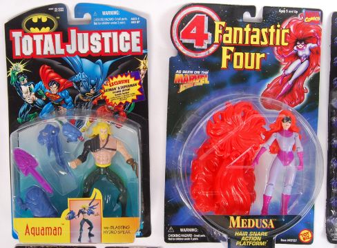 A good collection of 6x Marvel / DC Comic Book / Superhero carded action figures. All sealed, with contents mint. To include; Kenner Batman Total Justice series ' Aquaman ', Toy Biz made Spider-Man Bug Busters, Hasbro Marvel's Rhino, Toy Biz Iron Man Arctic Armor, Fantastic Four etc. Good collection. All sealed / mint.
