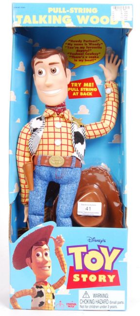 An original Think Way Toys made Disney Pixar ' Toy Story ' Pull String Talking ' Woody ' doll action figure. In fully working order. Appears mint and unused, within the original box.