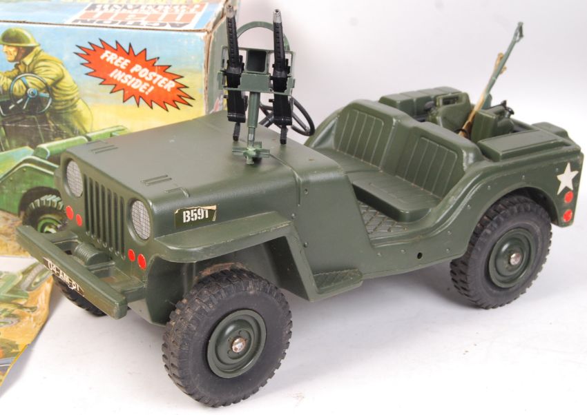 An original vintage rare Action Man ' Transport Command ' ' Armoured Jeep ' Palitoy action figure playset. Within the original box (stars uncut). Largely complete with accessories - missing a net and the machine gun mount. Boxed. With the original ' Free Poster ' present.