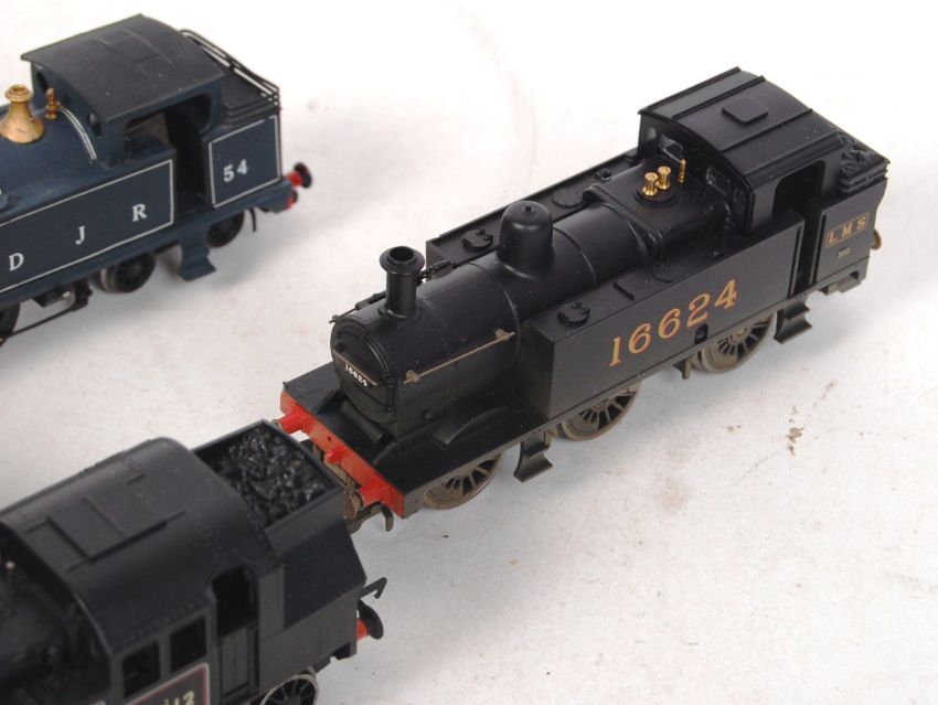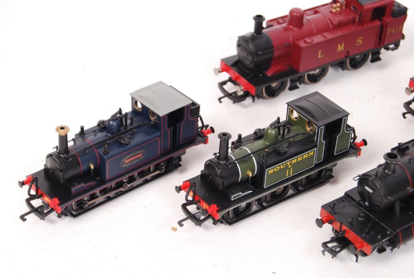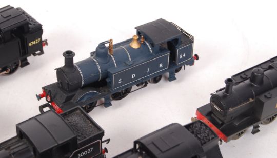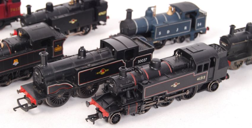 A good collection of 9x assorted make 00 gauge model rail railway trainset locomotives. To include; Hornby , Bachmann and others. Comprising: Hornby 7413 LMS, Hornby Bodiam , Hornby Southern II , kit built SDJR 54 loco (blue), Bachmann 41212 , Bachmann 4557 , Hornby 30027, Hornby 47427 (body loose) and Hornby 16624 (weathered) (body loose). All generally appear very good / mint.  Note: from an incredible large private collection of 00 gauge model rail locomotives. All locomotives were only ever displayed, never run. They were purchased new, removed from their boxes and displayed in wall mountable cabinets. As such, condition on all is 'as new' (whether boxed or not). Buyers are reminded for the need to satisfy themselves as to condition of individual lots prior to bidding - irrespective of description - as condition on some, may vary. All models are generally mint. An incredible collection.