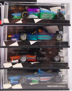 A collection of 9x Minichamps made 1:43 scale precision diecast model Formula One racing cars. All appear mint, unused, within the original display boxes.
