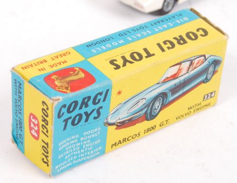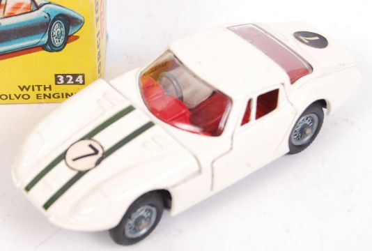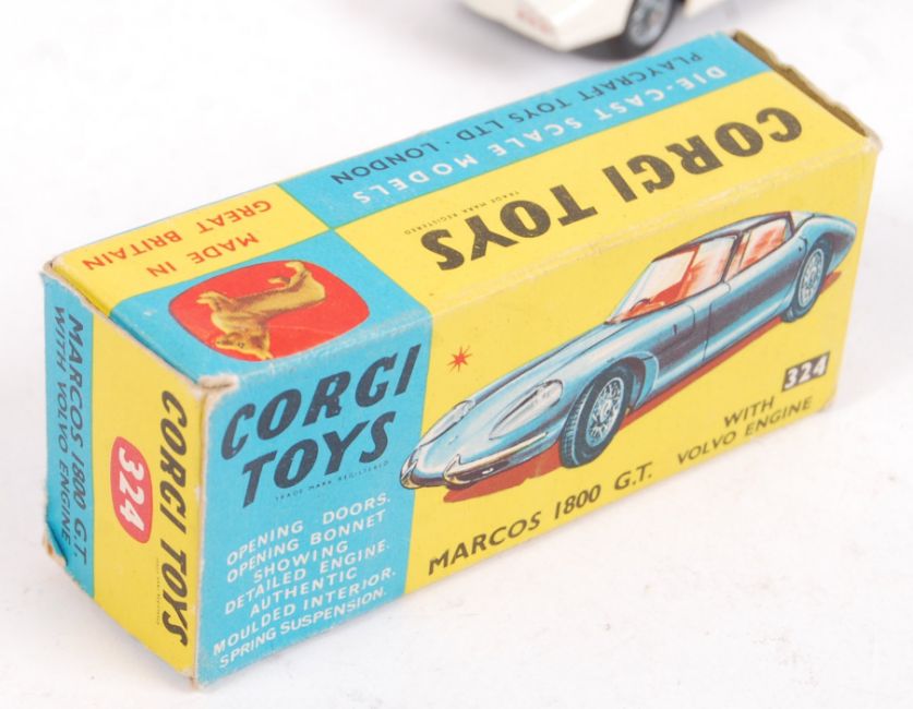 An original vintage Corgi Toys made diecast model car No. 324 ' Marcos 1800 GT With Volvo Engine '. White, with No.7 decals. Model appears near mint, within a fair to good original box.