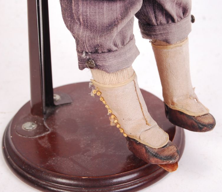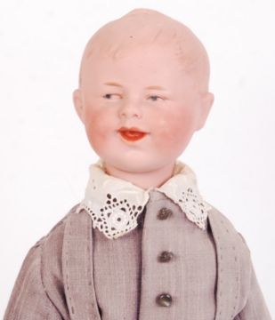 A rare antique late 19th / early 20th century German made Gebruder Heubach ' Boy ' doll. Cloth body, with bisque head and limbs. Moulded bisque head with moulded hair, pronounced cheeks and the expression ' grinning .' Bisque arms, with all fingers intact. Presumed original clothing comprising of a trouser suit, with lace collar and leather boots. The back of the head marked ' Heubach 1911 .' Measures approx; 42cm tall. Rare.