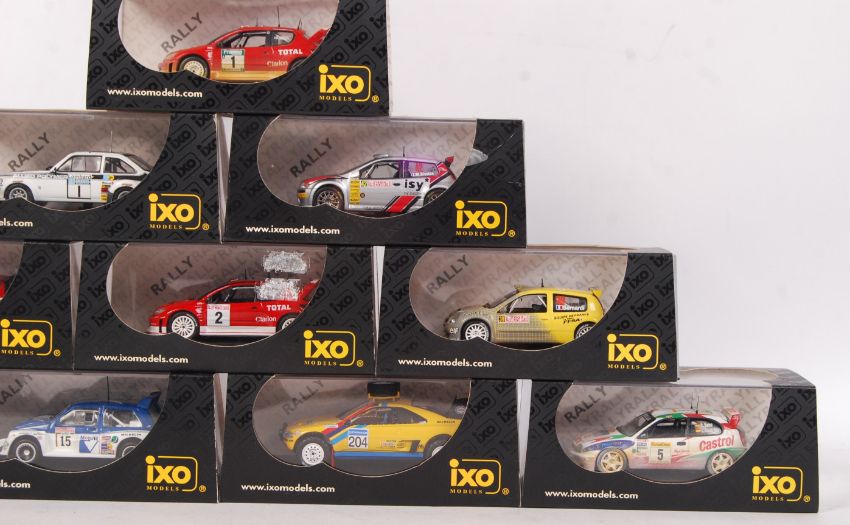A collection of 10x IXO Models 1:43 scale precision diecast model rally cars to include; RAM161, RAM078, MDC003, RAM153, RAM148, RAC042, RAM101, RAM147, RAC007 & RAC034. All within their original plastic cases, with outer sleeves. Mint, unused, as new.