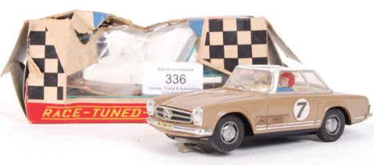 An original vintage Scalextric ' Race Tuned ' boxed slot racing car C32 ' Mercedes '. Appears within the original box (box tatty). Original decals present, brown with white roof. Rare slot car.