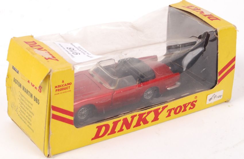 An original vintage Dinky Toys diecast model No. 110 ' Aston Martin DB5 '. Red, with black interior. Within the original export box. Model appears near mint, outer box fair to good. Some crushing and splitting of the plastic. Rare.