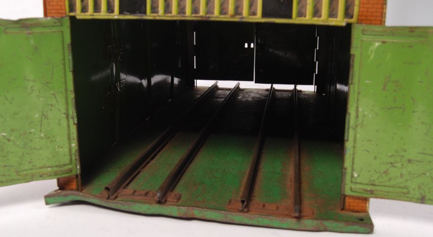 A vintage Hornby Series 0 gauge clockwork railway trainset locomotive / Engine Shed ' 2A '. Rarer basic version with no roof vents and a single upper section to the roof. All doors present. Complete, but signs of use - some bends and minor corrosion. Generally fair to good. Measures approx; 47cm long.