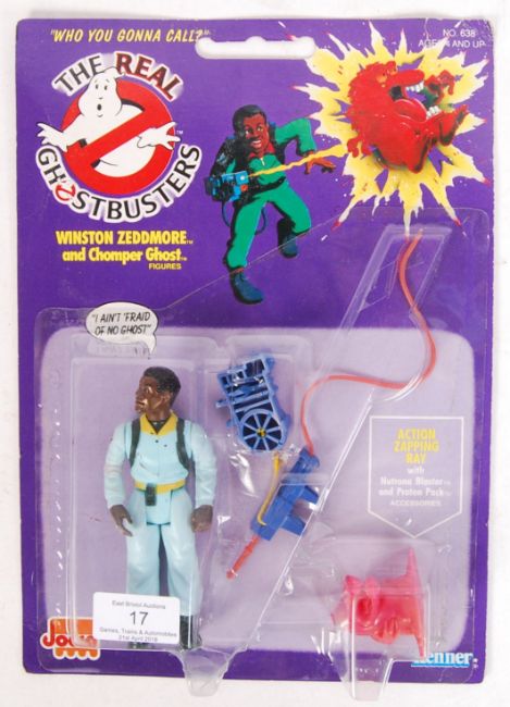 An original vintage retro 1980's Kenner made ' The Real Ghostbusters ' carded first issue action figure ' Winston Zeddmore and Chomper Ghost.' Carded, unused, on original card back.