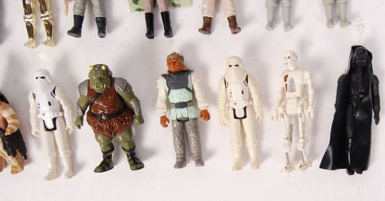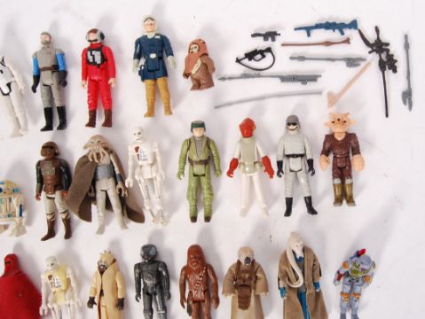 A large collection of assorted vintage Palitoy / Kenner Star Wars action figures . To include; Chewbacca, Han Solo, Snowtrooper, Darth Vader, Boba Fett, Bib Fortuna, Obi Wan Kenobi, C3PO, R2D2 and many others. Along with a collection of assorted weapons / guns / staffs etc. Good collection.