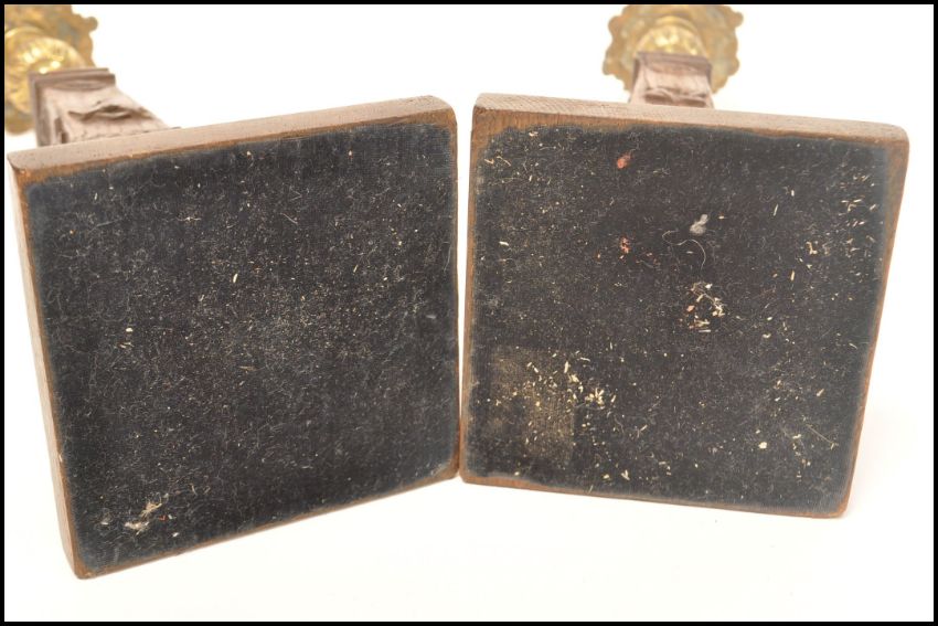 A pair of Masonic carved wooden souvenir candlestick with cast brass sockets, the base of each stem with an applied brass plaque engraved 'Oak from Roof of Glasgow Cathedral /Restored 1911-12', each 29.5cm high.