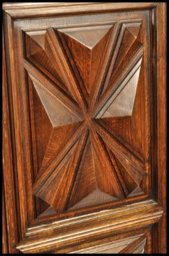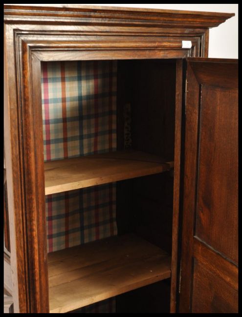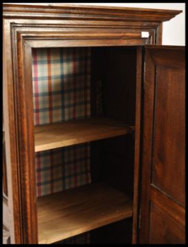 A 19th century country oak French Bonnetiere hall cupboard / armoire linen press. The upright sentry box form raised on pad feet with flared apron having stunning lozenge carved fielded panels with flared cornice atop. The full length door housing a set of shelves within. Measures 180cms x 79cms x 48cms