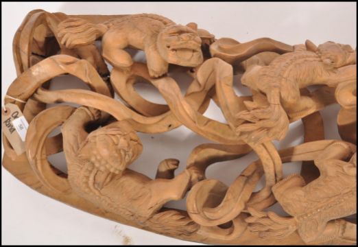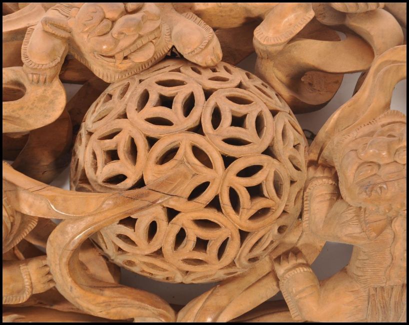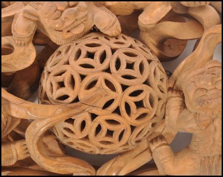A large unusual believed 19th century Chinese hardwood carving puzzle ball wall sculpture. The large carving having central puzzle ball surrounded by scrolled dragons and motifs. Measures 154cms long x 48cms high