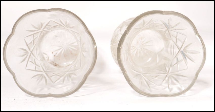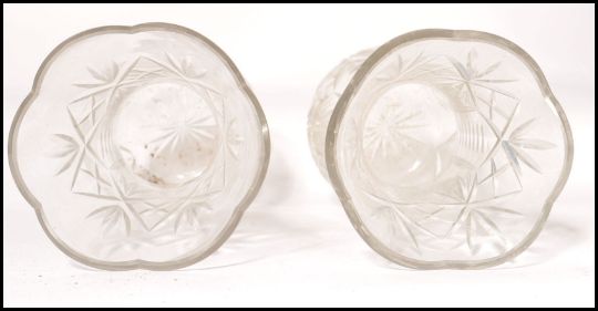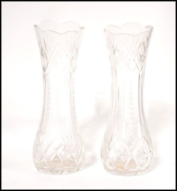 A pair of 20th century cut glass crystal vases, Each being facet cut with a further unusual decoration of graduating spheres to each side. Each Measures 36cms high