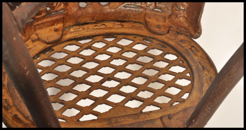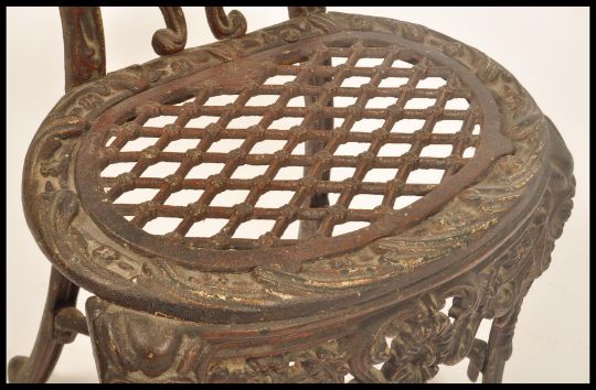 A 19th century eclesiastical cast and wrought iron chair in the manner of Coalbrookdale. The chair with balloon back and rococo scroll work over pierced seat with velved pad cushion being raised on shaped legs
