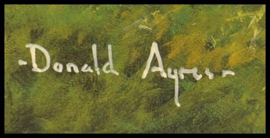 Donald Ayres (British, b. 1936), Dartmoor Hunt hunters and their dogs in a hilly landscape with buildings and church oil on canvas painting signed by artist to comer. Notation to verso. Measures frame 52cms by 42cms.