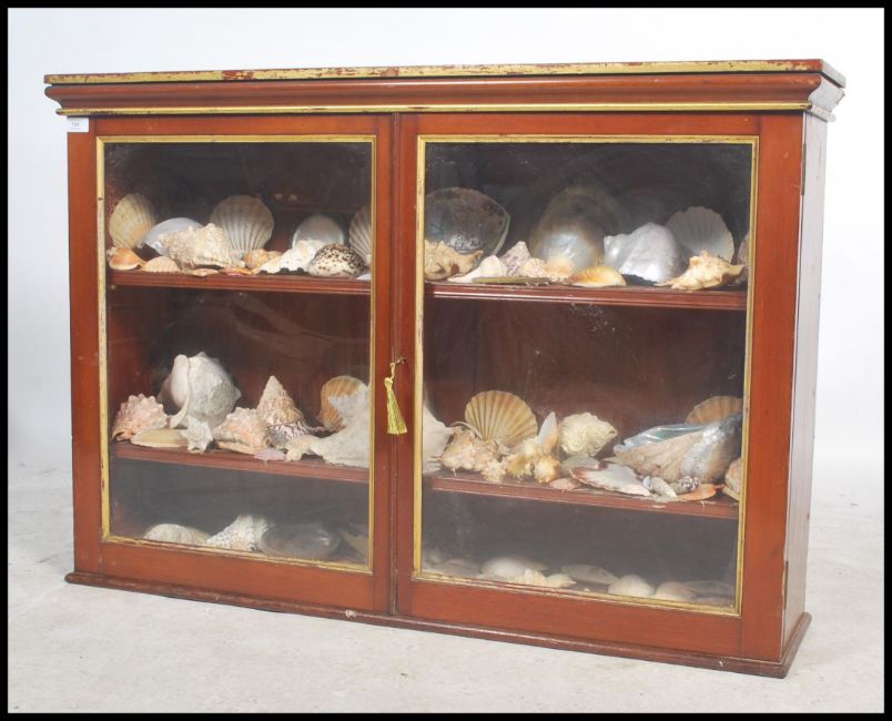 A 19th century mahogany shell cabinet having two glazed doors with gilt painted slips. The cabinet having two shelves stocked with various sea shell of differing form and sizes. Complete with key and having flared cornice above. 77x111x27cm.