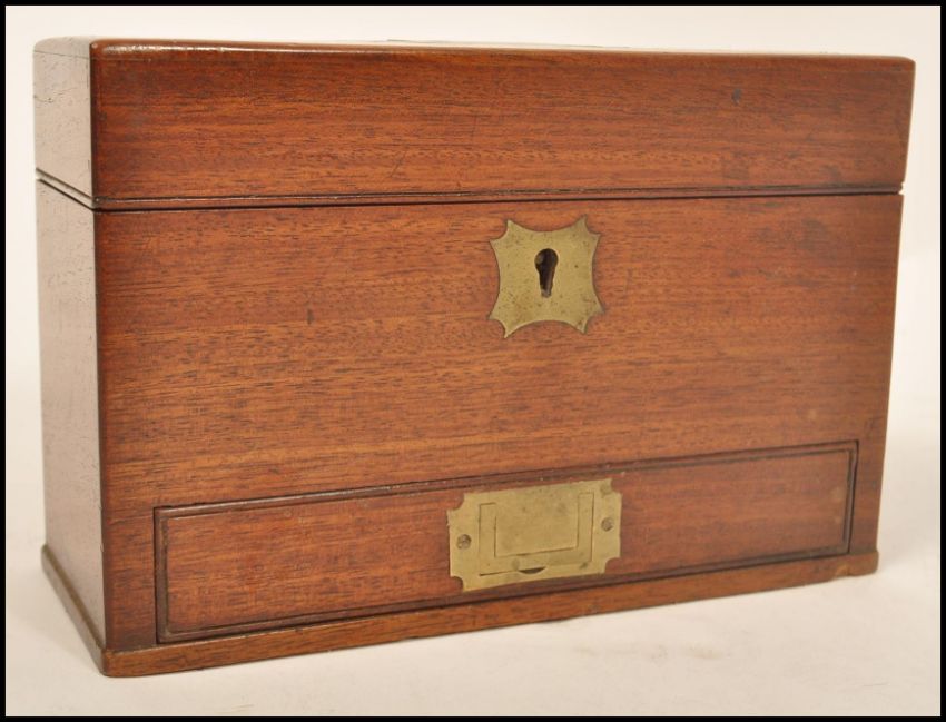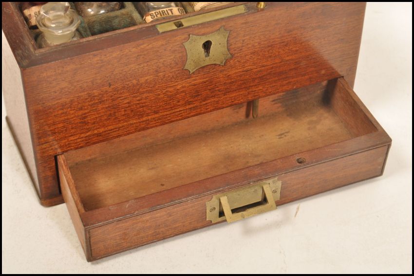 A 19th century apothecary box by Bromfield Chemist and Co Tottenham Court. The box mahogany construction with brass escutcheon and handle. Hinged lid opening to reveal a appointed interior with various bottles. Drawer to front with stick lock.