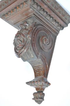 A pair of 19th century large solid walnut carved wall brackets rising from inverted finial bases through s-scroll bodies having grotesque human masks to the front culminating in sectional gadrooned terraces atop. H40cm x W30cm x D29cm