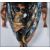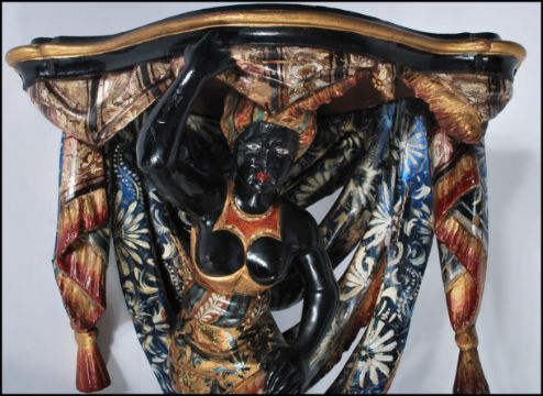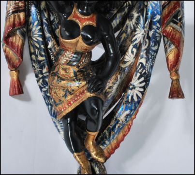 A believed 19th century blackamoor carved wooden gilded and painted corner wall bracket - clock bracket. The shaped corner top with moulded edge above a carved female blackamoor figure within carved sashed and tasselled surround having handpainted decoration and gilded borders elsewhere. Measures 55cms High