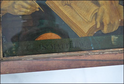 A rare pair of believed of late 18th century reverse-prints on glass of The Gospels, Saints Matthew & St Mark. Each being set within oak frames having notation to each at the base. Measures 31cm wide x 41cm high.
