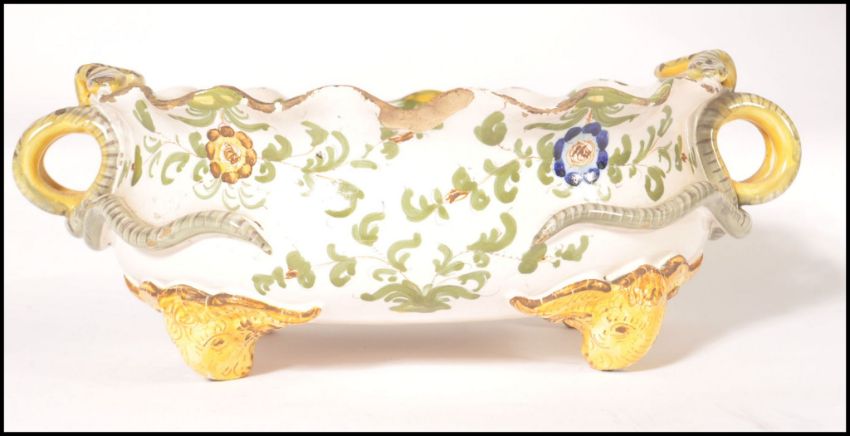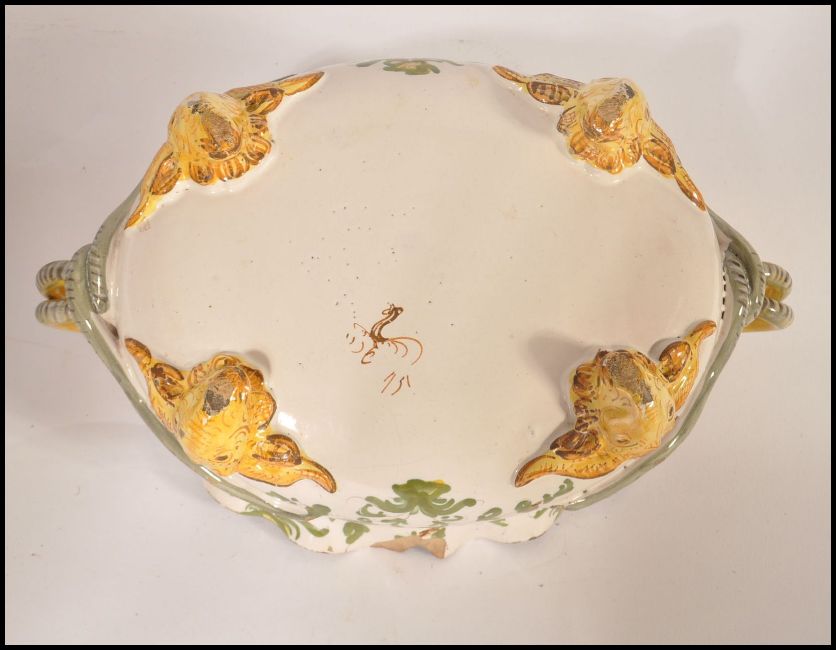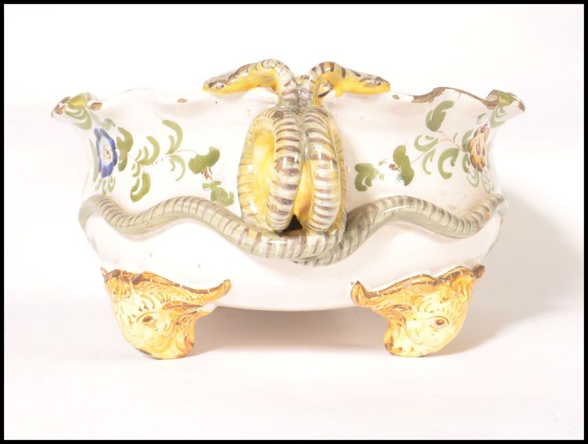 A 19th century continental Faience twin handled fruit bowl raised on rams head feet with serpentine snake embellished handles. Floral sprays and flowers elsewhere. Measures 11cms high x 33cms wide. Makers mark to the base