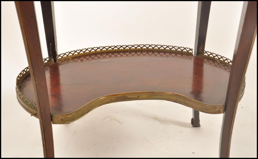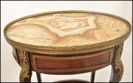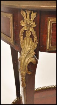 An Edwards & Roberts Edwardian kingwood and marble console - lamp table. Of oval form with veined marble top having pierced gallery surround raised on sabre supports having applied gilt metal ormulu embellishments. The single drawer being stamped for Edward & Roberts