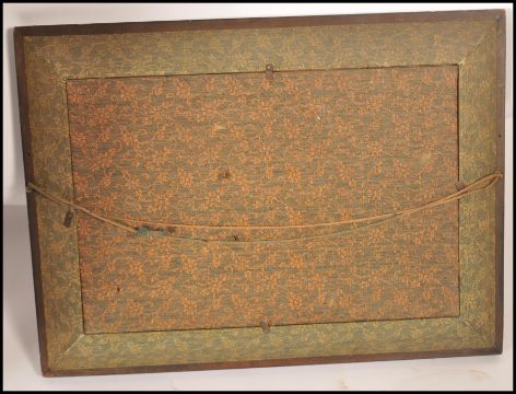 A Meiji period Japanese silk embroidery of a lion and lioness resting among grass. Highly detailed features on black ground set in a glazed ebony frame with gilt slip border.