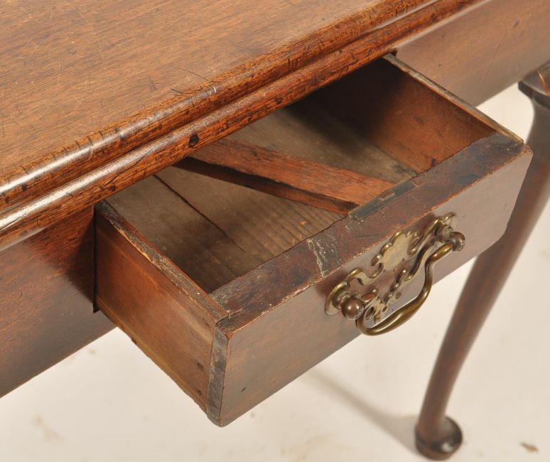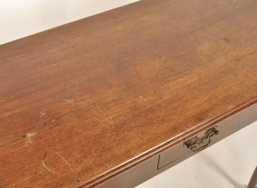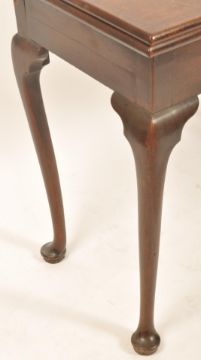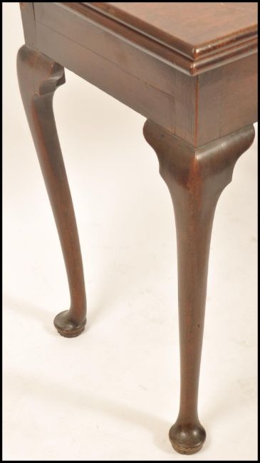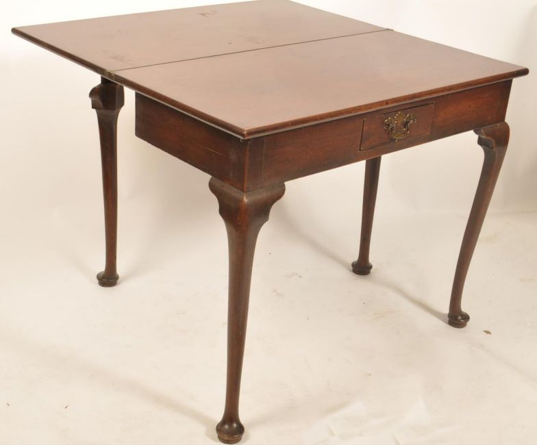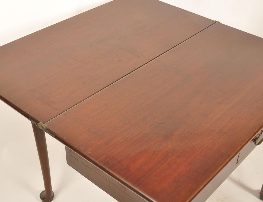 An 18th century Georgian solid mahogany fold over tea / games card table having a serpentine edge with double fold out back leg, raised on squared legs. with a single drawer to the frieze