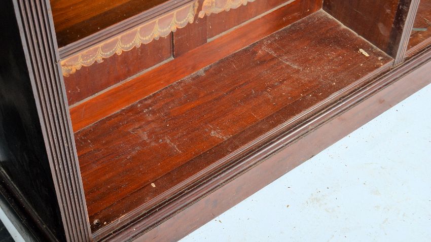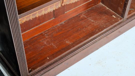 A good large Victorian mahogany triple section library bookcase cabinet of open window form. The three very large upright sections being raised on a plinth base and culminating in a fiared top above. Each shelf being adjustable and supported on brass pegs, the fronts of each shelf with tooled leather arcades. Measures 245cms high ( 8ft ) x 265cms wide ( measured at centre) x 29cms depth ( measured at centre ) The shelves measures 82.5cms wide each by 25cms depth