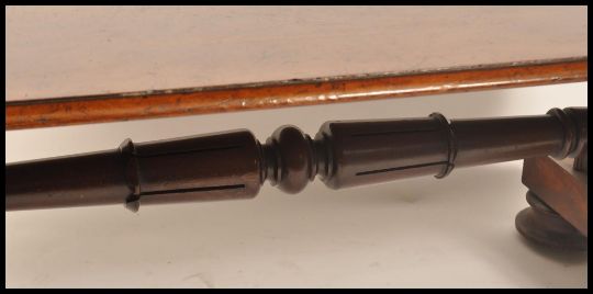 A 19th century Regency mahogany metamorphic two tier library table. Circa 1825, the table raised on square tapering columns having adjustable twin tiers with brass lock mechanism. Raised on splayed legs with bun feet and  half moon caubels of reeded form. Measures 98cms by 116cms by 61cms.
