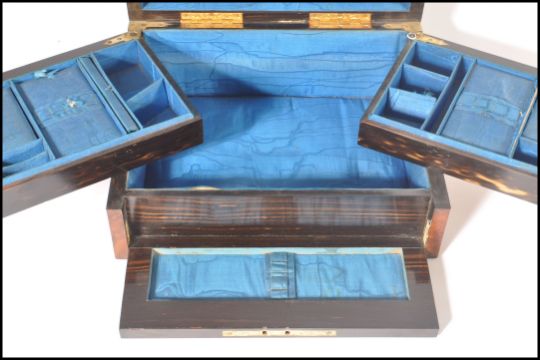 A 19th century walnut dome top ladies workbox dated and inscribed with brass inset monogram cartouche for March 22nd 1880. Opening to reveal full appointed blue silk lined interior with drop down coromandel lined front and 2 further cantilever sections. Measures 15cms high x 30cms wide x 23cms depth