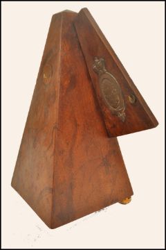 A 19th century French metronome in walnut pyramid shape case, bears brass plaque for Maelzel Paque London. Brass ball finial feet. Measures 24cms high