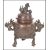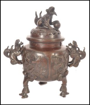 An unusual believed 19th century Chinese bronze  censur - ding cauldron having a circular bowl aised on 3 scholart human figures with stunning decoration to the sides and embellished temple dog handles. Pierced lid top with further fu dog top. Measures 23cms tall