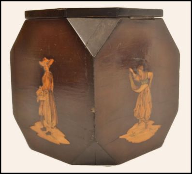 A 19th century Sorrento ware tea caddy of octagonal form with faceted sides. Each side having an inlay scenes of figures with donkey scene to the lid. Hinged lid opening to reveal lead liner and signed Sorrento to lid. Measures 11.5cms x 10cms x 10cms