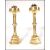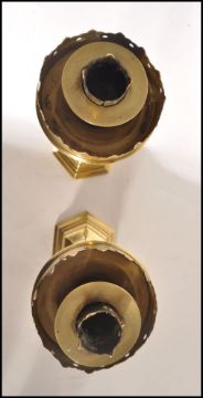 A pair of believed Pugin 19th century Victorian heavy brass candlesticks of hexagonal column form with stepped solid bases.  Single sconces with circular pierced arcade surrounds. Measures 33cms high